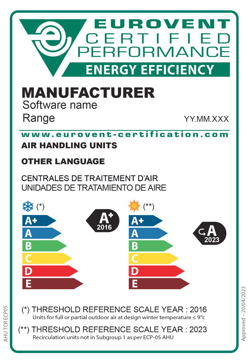 AHU energy efficiency is expressed by a label in classes from A+ to E. Only Eurovent certified units may be marketed with this label.