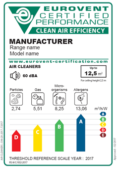 As part of this certification programme, Clean Air Efficiency Classes are certified. These classes are represented in a dedicated Efficiency Label to allow end-users to compare easily between the different independent air cleaners.