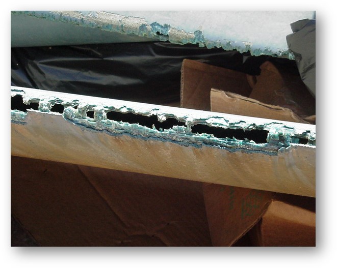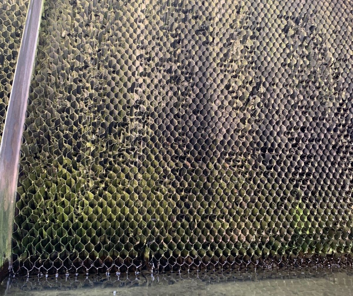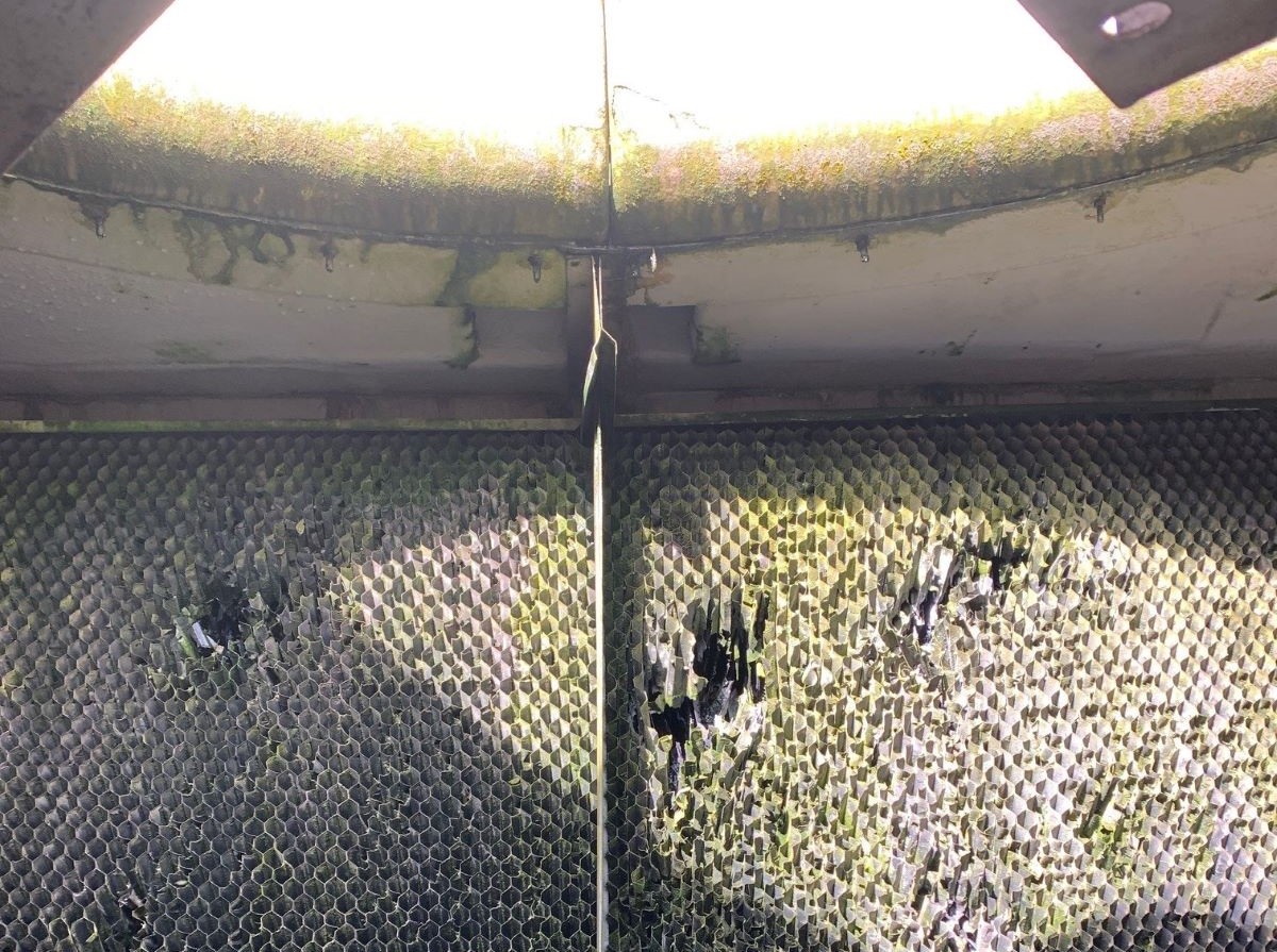 Pictures above show significant erosion and corrosion within a cooling tower above the drift eliminator, especially when a very poor rated % drift has been installed or damage to the drift has occurred.