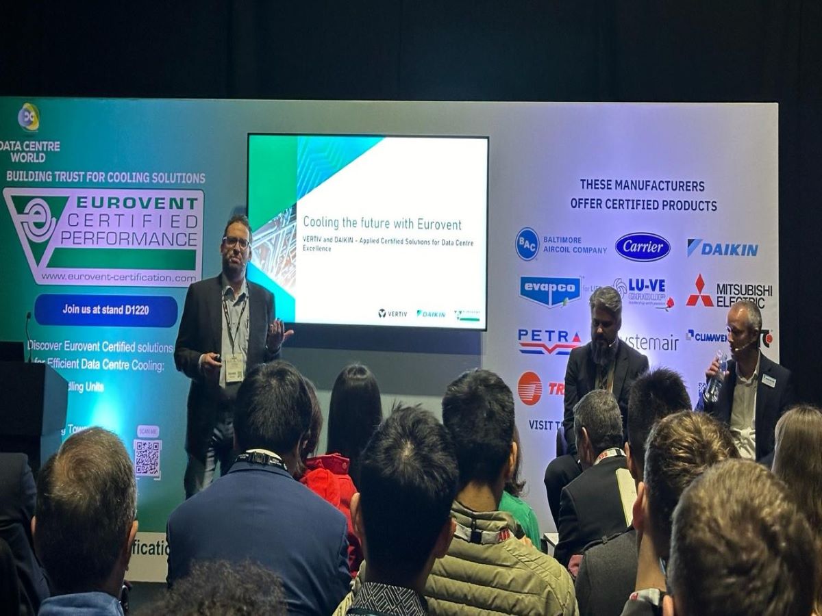 First up on March 6th, ‘Cooling the future with Eurovent: VERTIV and DAIKIN Applied Certified Solutions for Data Centre Excellence’ saw Eurovent Certification’s Sales Manager, Tim Kroeger joined on the stage by Alessandro Zerbetto, Global Offering Manager at Vertiv and James Henley, Product Development Manager at Daikin Applied. Tim introduced the principles and process of certification, emphasising that certification is earned, not bought, and briefly covered global trends before encouraging the delegates to attend the stands of the certified manufacturers exhibiting at the show.